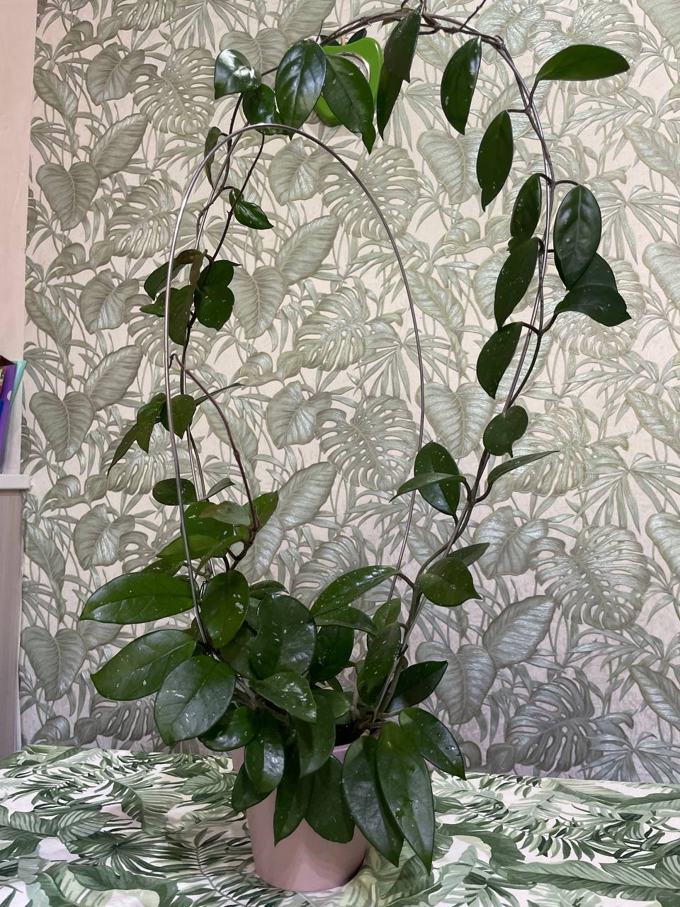 - Для Офиса (символ стабильности и роста): Ее длинные, упругие плети — это метафора карьерного роста и развития. Хойя некапризна, стойко переносит сухой воздух офисов и не требует постоянного внимания, идеально подходя для занятого человека. Ее можно выращивать как ампельное растение в подвесном кашпо, украшая кабинет или холл, или пустить по стильной опоре, создав живую скульптуру.